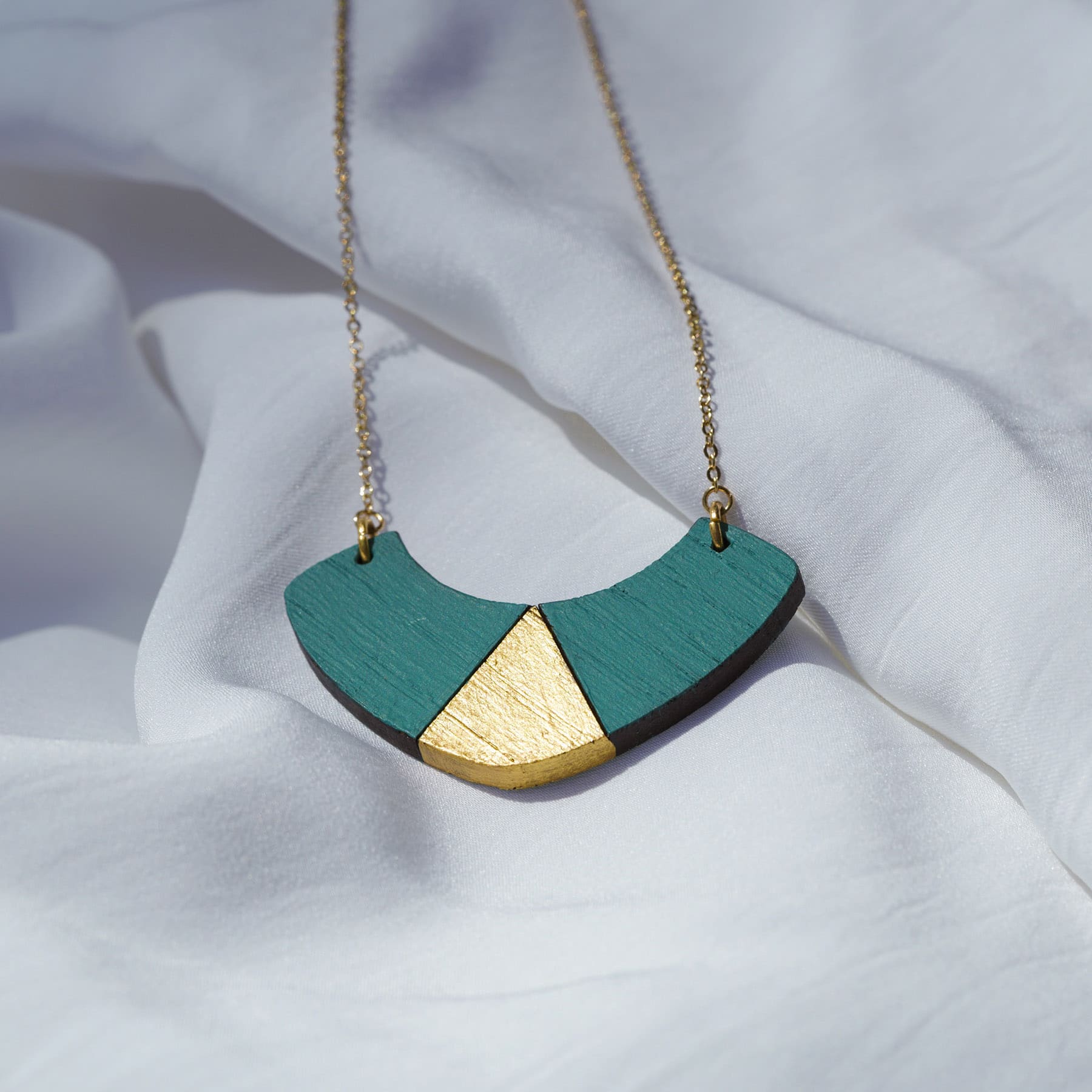Madera de roble sostenible pintada a mano en verde y dorado o negro y dorado, con cierres y cadena de acero inoxidable.